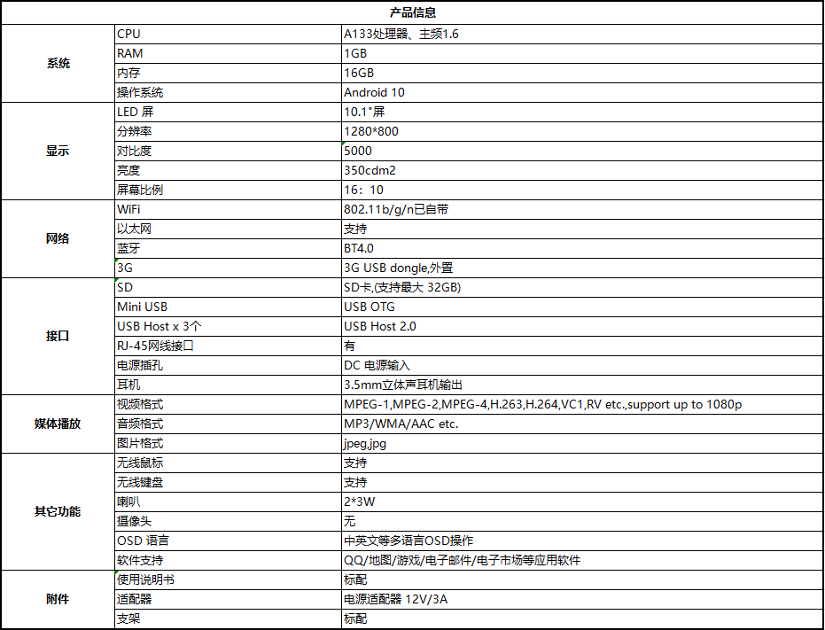 | 分辨率 | 1024*600 |
