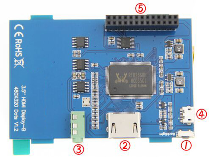 ⑤樹(shù)莓派26PIN母座:用作樹(shù)莓派顯示器時(shí)從此處獲取電源和返回觸摸